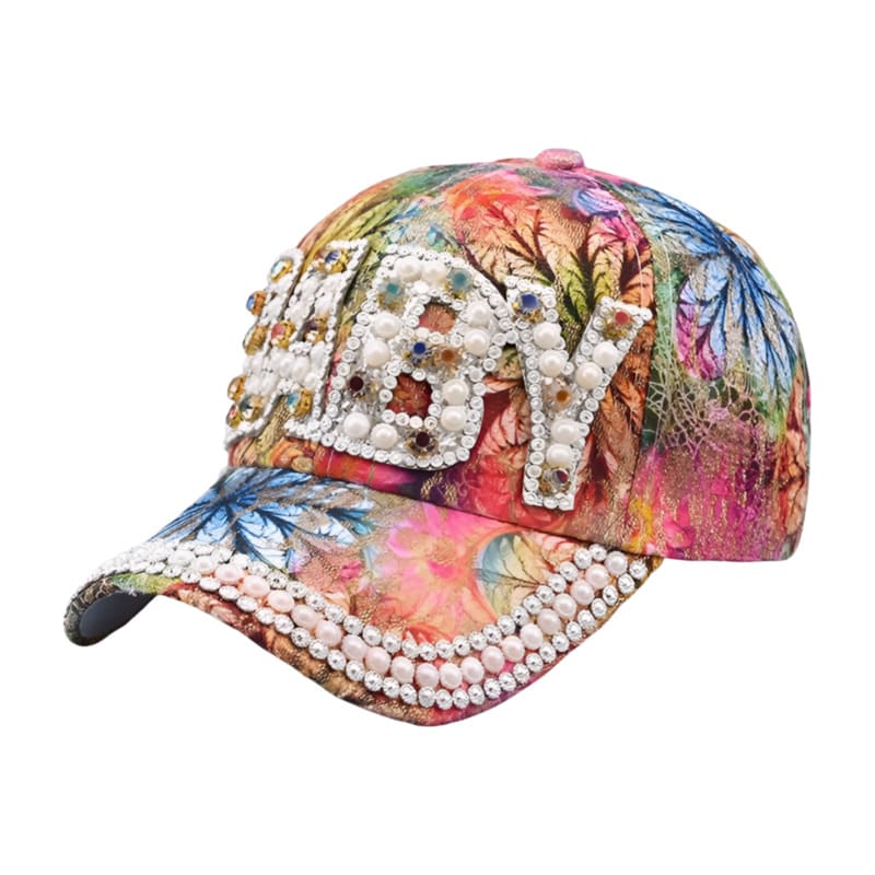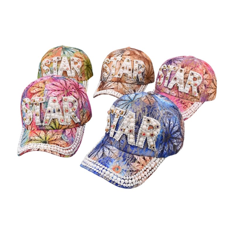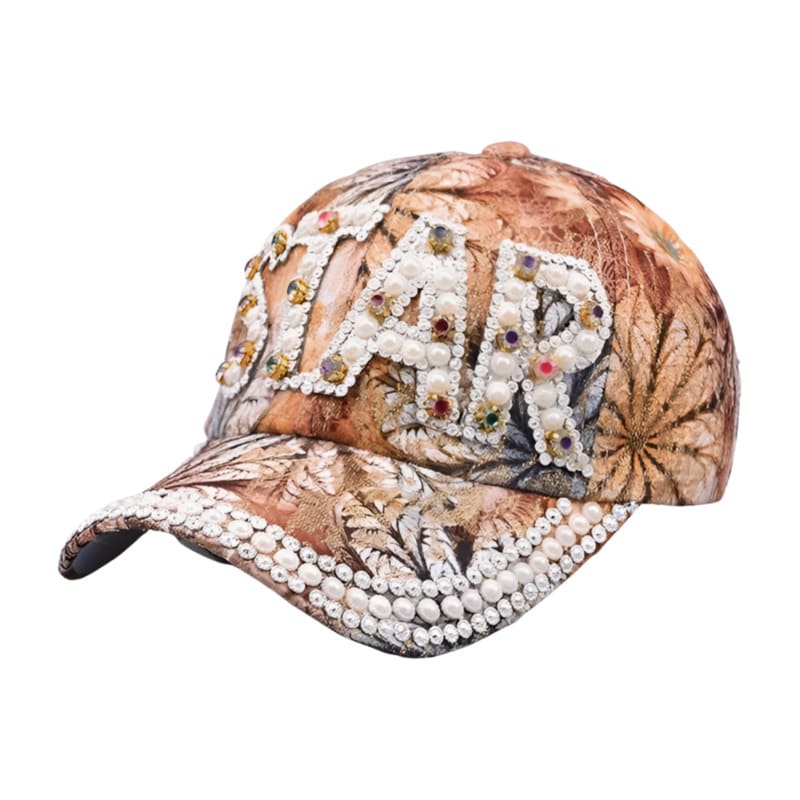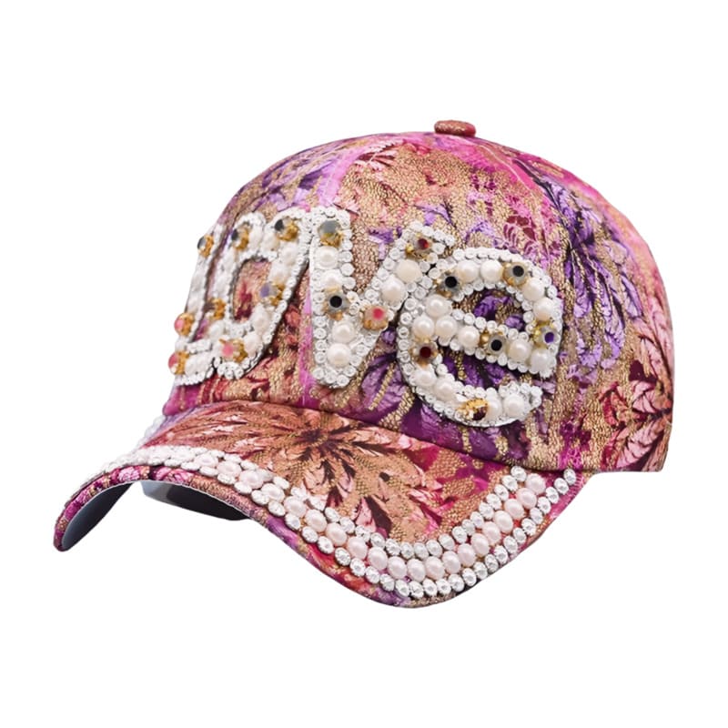 Esta gorra de béisbol para mujer presenta bordados de corazones y estrellas combinados con brillantes detalles florales de pedrería para crear un look elegante, femenino y llamativo.