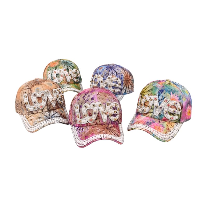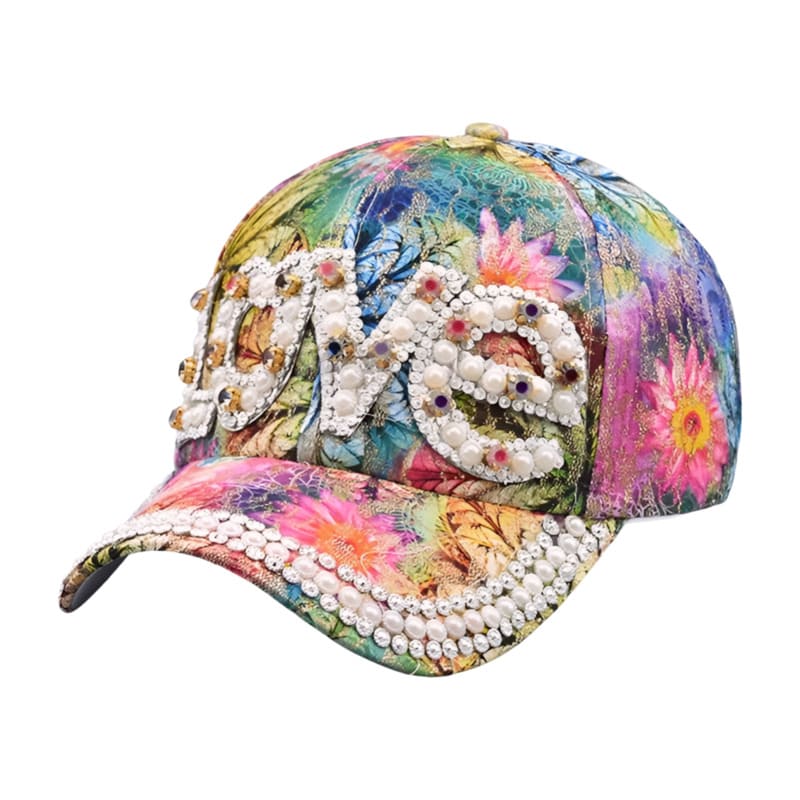 Gorra de béisbol de moda para mujer con bordado de amor y estrellas y detalles florales con pedrería.