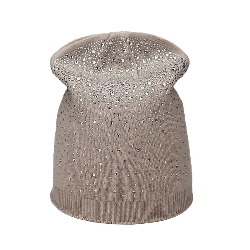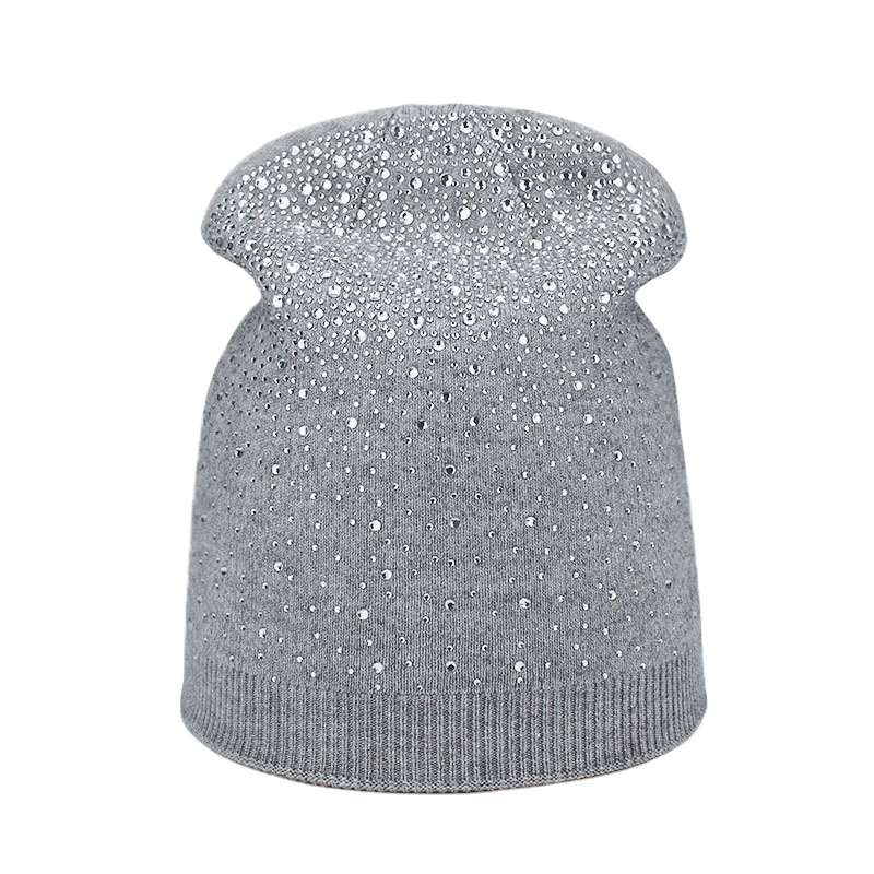Gorro de invierno cálido con pedrería para mujer: gorro de algodón tejido con diamantes brillantes para mujer.