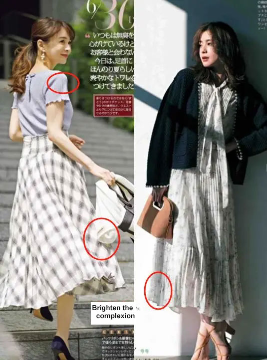 After all, they always manage to choose colors that flatter their skin tone, instantly brightening their complexion , which is perfect for everyday people like us. For example, the purple plaid skirt in the left picture, or the light white floral dress worn underneath in the right picture, makes the models look fresh and fair-skinned.