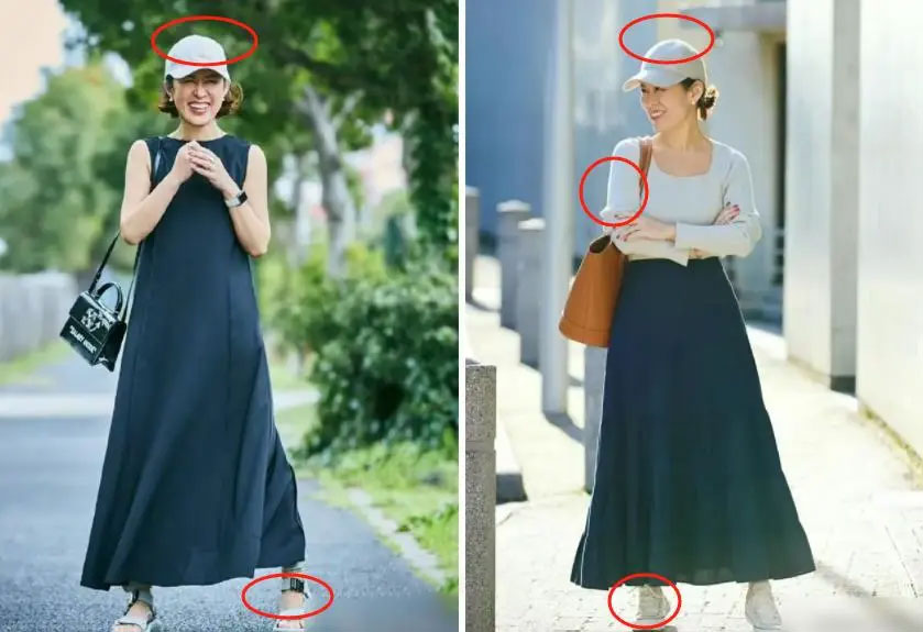 It turns out that this “the skirt + hat” combination not only looks good, but is also incredibly practical. For example, the solid-color skirt paired with a baseball cap in the left picture doesn’t look as monotonous as wearing a skirt alone.